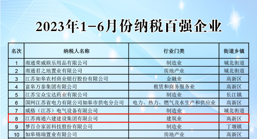 如皋市財政局日前發布2023年1-6月份納稅百強企業名單,集團位列如皋百強榜單第8名,建筑業第1名!